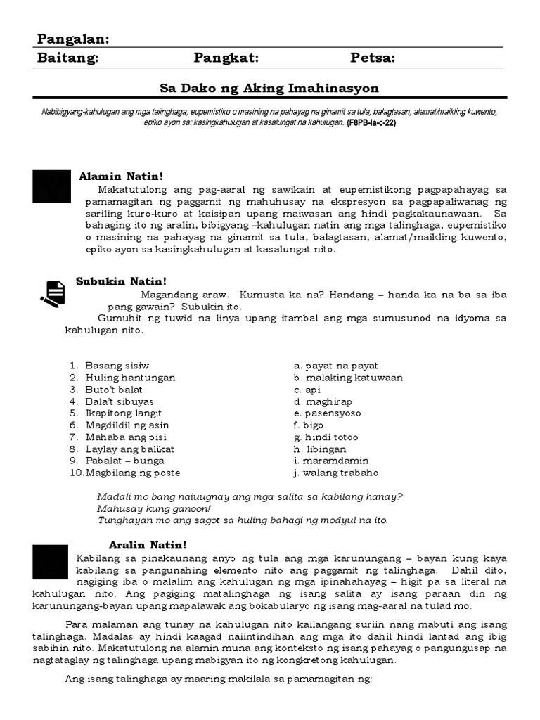 Ambag Tukuyin ang pangatnig na ginamit sa pangungusap. Kulturang Filipino Answer shits. Piliin sa loob ng kahon ang kasingkahulugan ng bawat salita.